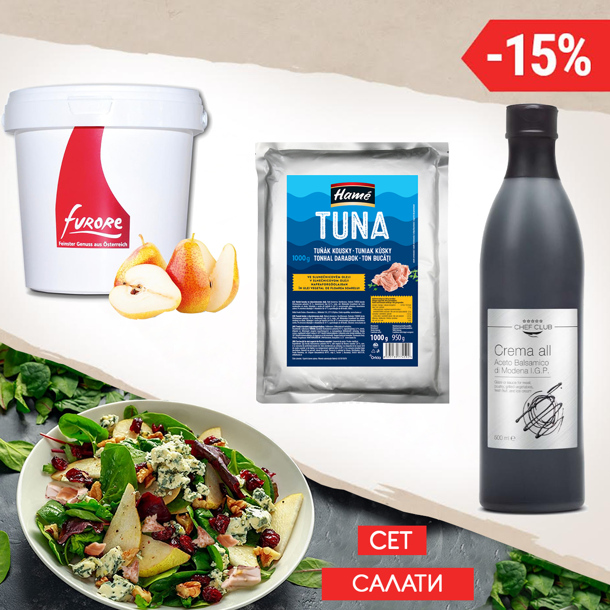 Предлагаме Ви сет от 3 продукта, за разнообразно салатно меню, отличаващо се с креативност, бързо приготвяне и включващо премиум продукти, които можете да ползвате и в други кулинарни творения!